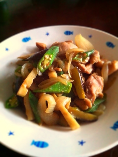 ナスとオクラの鶏肉味噌炒め