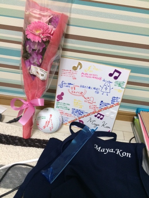 記念品に、花束、色紙、名前入りエプロン、バネかけ、ソフトボール(ティンパニの工具)
